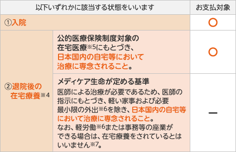 病気・ケガ(精神疾患以外)の治療を目的とした入院または退院後の所定の在宅療養※4に該当する状態を指します。