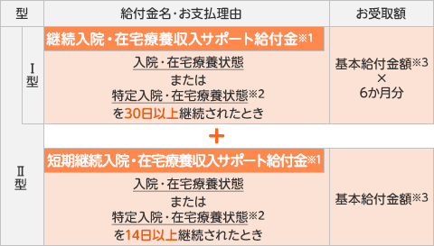 給付金対象期間中に、継続入院・在宅療養収入サポート給付金または短期継続入院・在宅療養収入サポート給付金のお支払理由に該当されたときは、これらの給付金をお支払いしません。