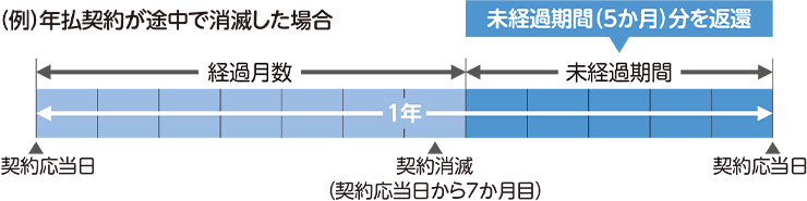 ご契約が途中で消滅(死亡・解約等)した場合や保険料のお払込免除となった場合には、お払い込みいただいた保険料から経過月数に対応する一括払保険料相当額を差し引いた金額を払い戻します。