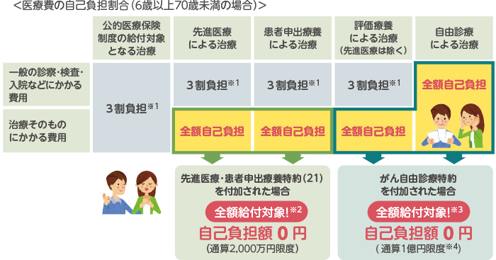 - *がん自由診療特約について、お支払いの対象となる評価療養および自由診療は、療養を受けられた時点において、所定の要件を満たす療養とします。